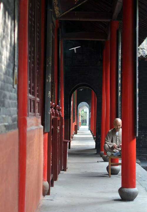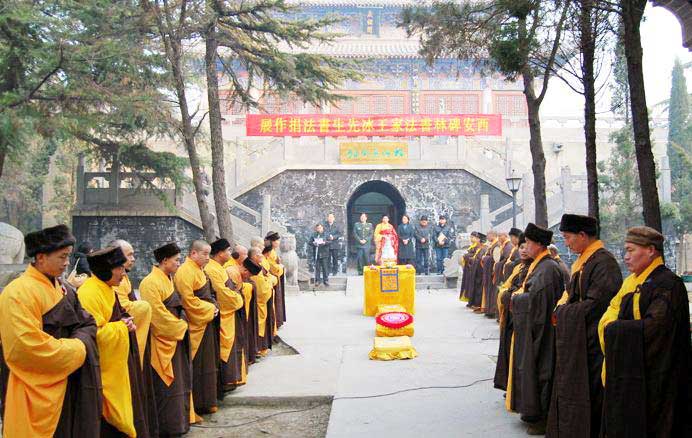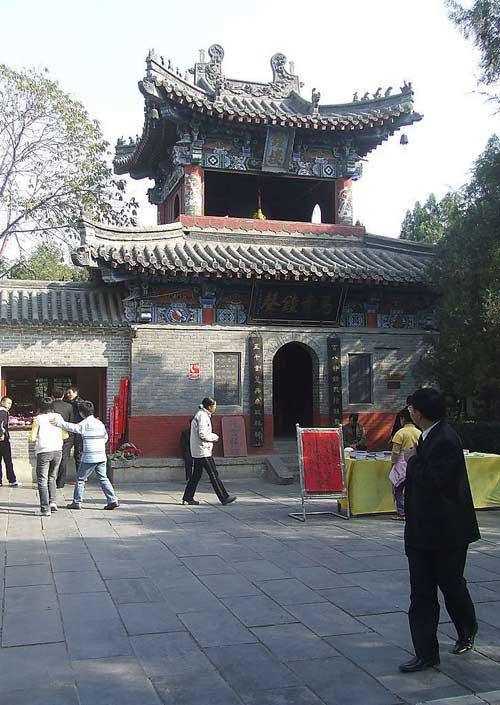 The third hall is the Main Hall, and houses three Buddhas: Sakyamuni, Medicine Buddha, and Amitabha Buddha, flanked by the eighteen Arhats. They treasures of arts of the Yuan Dynasty are vivid in modeling and graceful in painting. The wooden shrine in the hall houses over 5,000 statues of Buddha. The fourth hall is the Jieyin Hall. Behind the bamboo forest is the Qingliang (cool and refreshing) Terrace, with old pine trees flourishing, and halls connecting with each other. Four sides of the terrace are piled with green bricks. The Kunlu Pavilion stands prominent on the terrace. Halls on its east and west house respectively the statues of the two eminent monks, She Moteng and Zhu Falan, who were buried inside the Temple Gate after they passed away. In front of the tombs are the Bell Tower and the Drum Tower. The Horse Temple Bell Ring was once one of the eight great sceneries in Luoyang City.